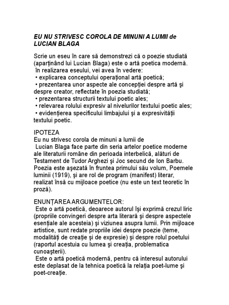 Corola de minuni a lumii eseu. Poezia eu nu strivesc corola de minuni a lumii este un manifest o artă poetică deoarece autorul îşi exprimă propriile convingeri despre arta literară şi despre aspectele esenţiale ale acestora teme modalităţi de expresie precum şi despre rolul poetului raportul acestuia cu lumea şi cu creaţia problema cunoaşterii. Eu nu strivesc corola de minuni a lumii lucian blaga. Eu nu strivesc corola de minuni a lumii eu nu strivesc corola de minuni a lumii şi nu ucid cu mintea tainele ce le ntâlnesc în calea mea în flori în ochi pe buze ori morminte. Lucian blaga a fost filosof poet dramaturg si traducator roman.