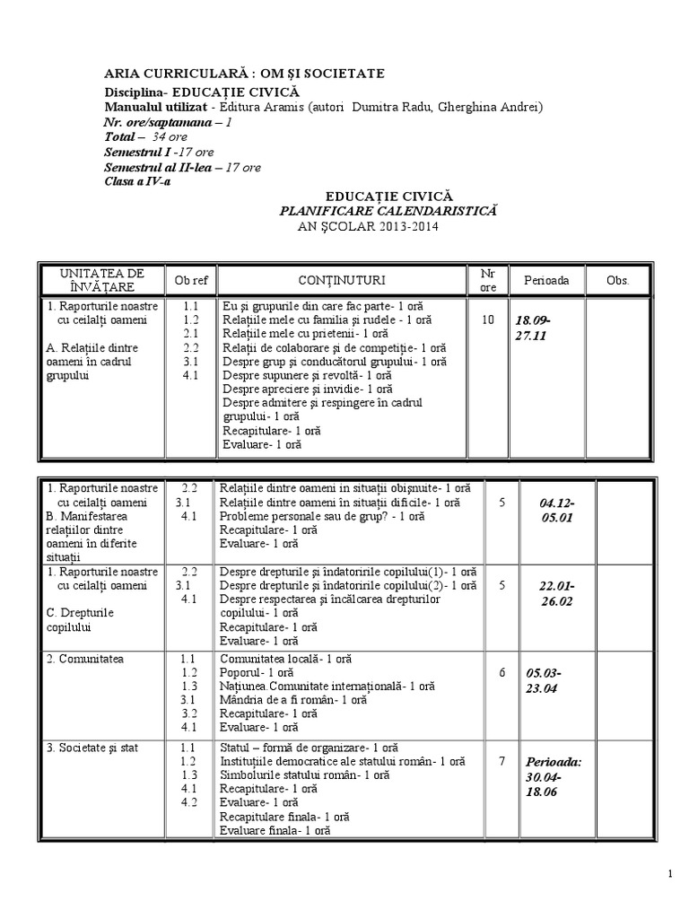 Planificare Educatie Civica Clasa 4 Varianta Radu Andrei Aramis