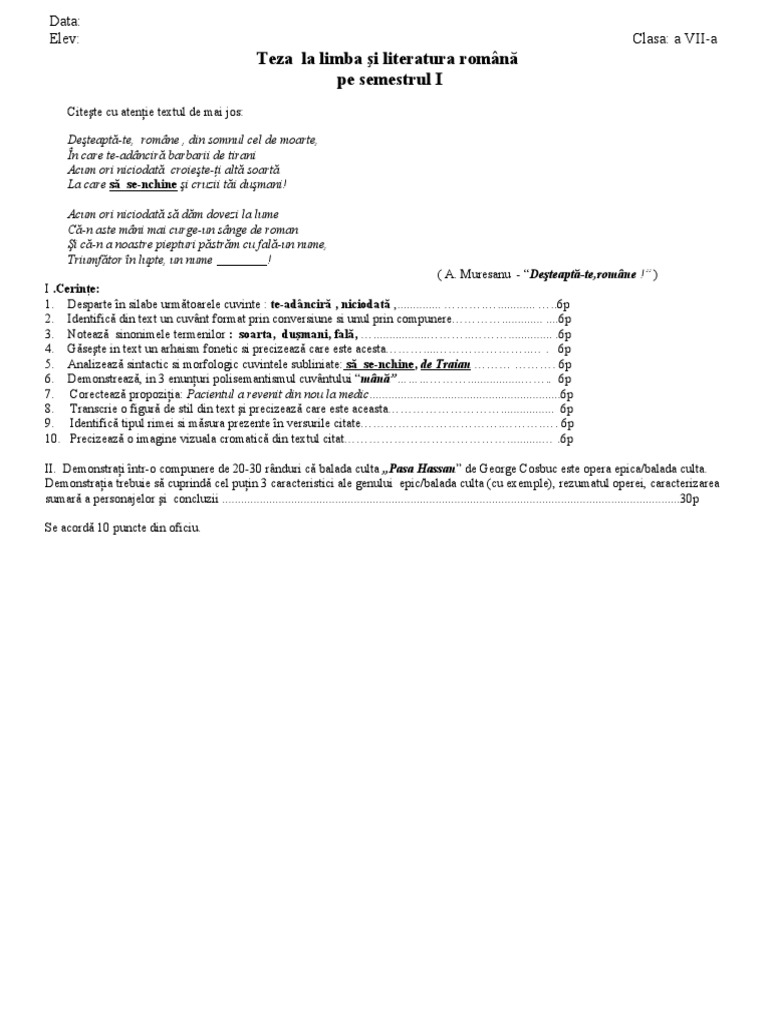 Care Imi Da Si Mie O Teza Online La Romana Azi O Dau Si Sunt Clasa A6 Sem 1 Brainly Ro